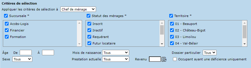 - Possibilité d'appliquer les critères de sélection à tous les occupants ou seulement les chefs de ménage